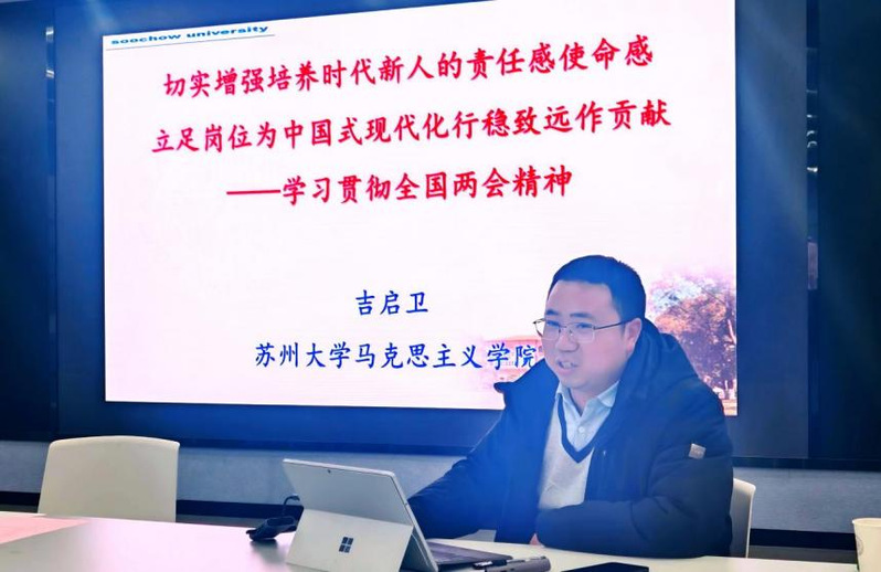 习近平新时代中国特色社会主义思想概论教研室主任吉启卫以“切实增强培养时代新人的责任感使命感,立足岗位为中国式现代化行稳致远作贡献”为主题,围绕学习贯彻习近平总书记在全国两会期间的重要讲话精神、政府工作报告、“十五五”规划纲要等内容就全国两会精神进行讲解。